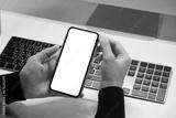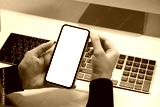 A woman is using a white blank screen smartphone while sitting in front of a computer monitor