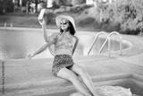 beautiful young hispanic woman taking selfie at the edge of the pool at sunset