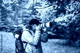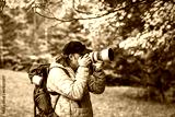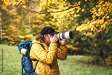 Hiker with backpack is wearing yellow jacket and photographing at his camera. Wildlife photographer in autumn forest