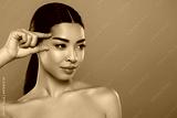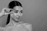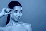 Photo of perfect lady touch finger face brows plastic collagen lifting empty space isolated on beige color background
