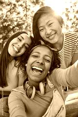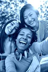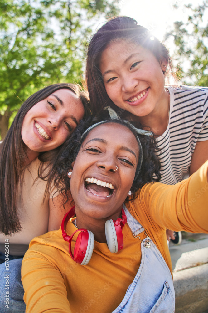 Vertical selfie three excited multicultural cheerful young women outdoor. Female having fun looking at smiling camera and making faces enjoying summer vacation, lens flare. Generation z in sunny park.
