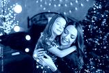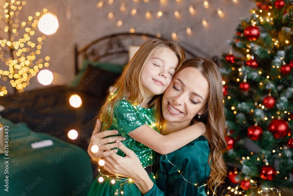 Portrait of a little girl and her mother hugging at Christmas atmosphere