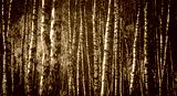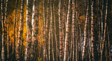 Rows of birch trees with golden leaves in golden autumn, illuminated by daylight. Aesthetics of vintage film.