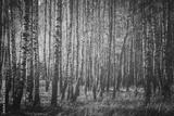 Birch grove with golden leaves in golden autumn, illuminated by the sun at sunset or dawn. Aesthetics of vintage film.