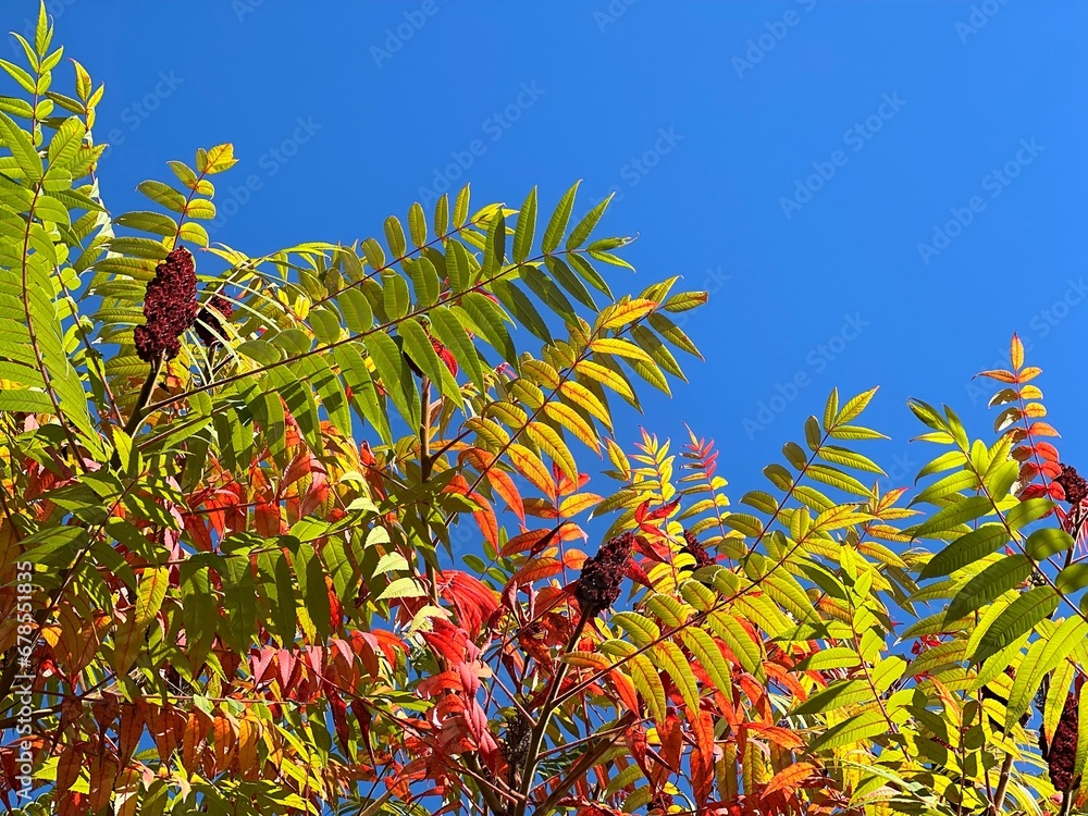 Autumn leaves rhus typhina, staghorn sumac, sumac vinaigrier on sky.