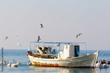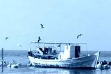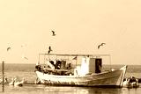 Fishing Boat and the fisherman surrounded by seagulls and pelica