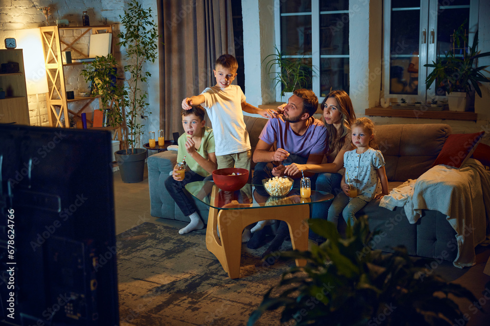 Family time. Man, woman and children watching Tv together at home in evening. Boy discussing movie scene with mother and father. Concept of family, leisure time, relaxation, childhood and parenthood
