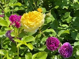 Floribunda roses flowers bush purple yellow beautiful blossom in rose garden