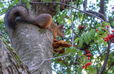 A squirrel sits on a tree trunk on a summer day.