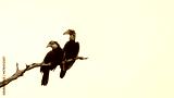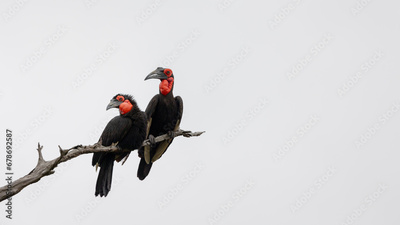 southern ground hornbill pair perched on a dead tree