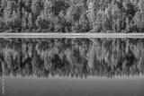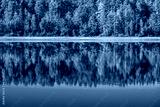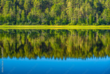 Reflection of the green forest in the calm water of the river on a sunny day.