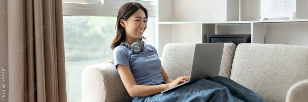 Asian woman sitting on the sofa with a laptop, Looking at laptop screen, Relaxing at home, Working through the Internet communication system, Happy lifestyle, Feel good.