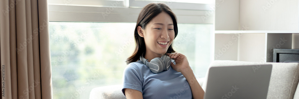 Asian woman sitting on the sofa with a laptop, Looking at laptop screen, Relaxing at home, Working through the Internet communication system, Happy lifestyle, Feel good.