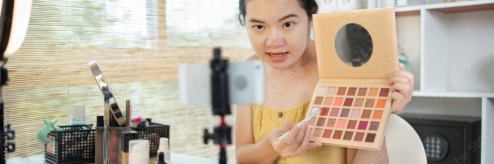 Beautiful women with social media influences recommend products and make-up accessories to be more beautiful, Recording vlog video live streaming, Online business of beauty bloggers.
