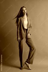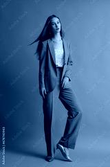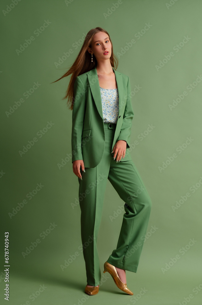 Fashionable beautiful confident woman wearing trendy suit blazer, classic trousers, floral print top, metallic color pointed toe kitten heel shoes, posing on green background. Full-length portrait