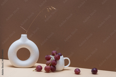 Still life with a vase with a dry spikelet and a mug with grapes on a brownish background.