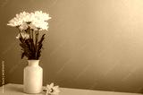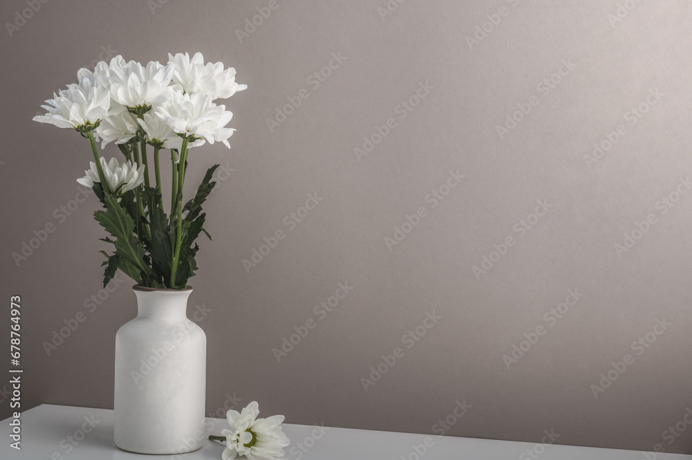 Bouquet of white chrysanthemums, daisies in a white vase on a white table.Greeting card, home interior.
