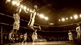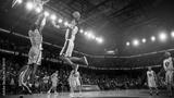 Basketball Championship Highlights on Live Television News Channel: White Team Player Passing the Ball Through Defence. Black Basketballer Scores a Successful Slam Dunk with One Hand