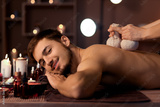 Young man undergoing treatment with herbal bags in dark spa salon, closeup