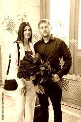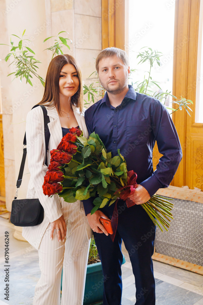 A couple of young men and women with a large bouquet of red roses.