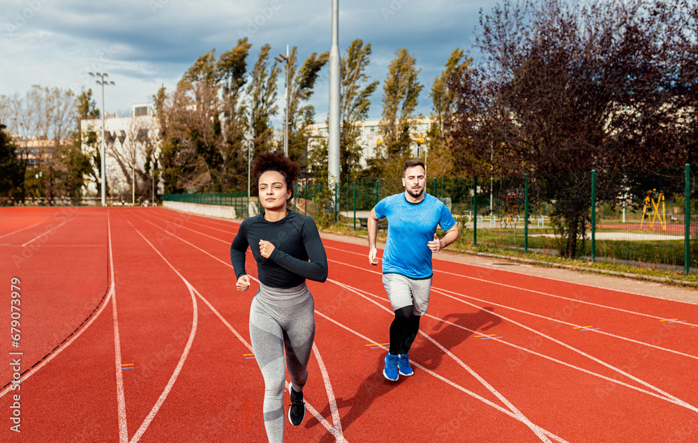 Woman and man doing morning workout outdoors running on track.