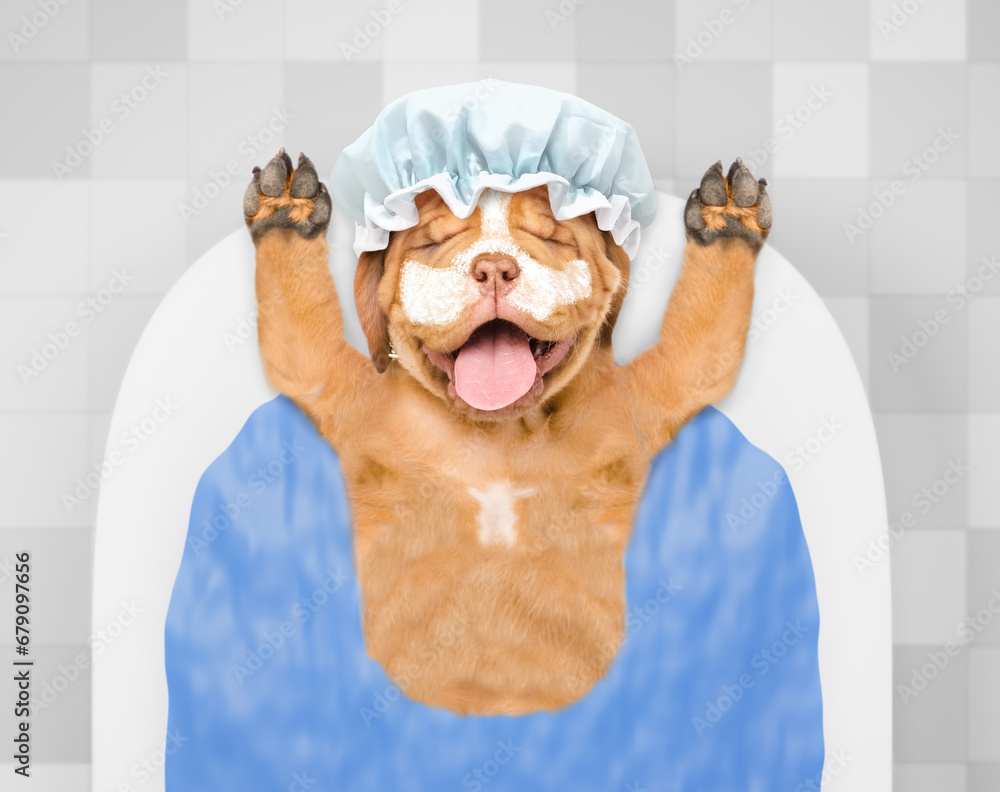 Happy Mastiff puppy wearing shower cap with cream on it face takes the bath at home. Top down view