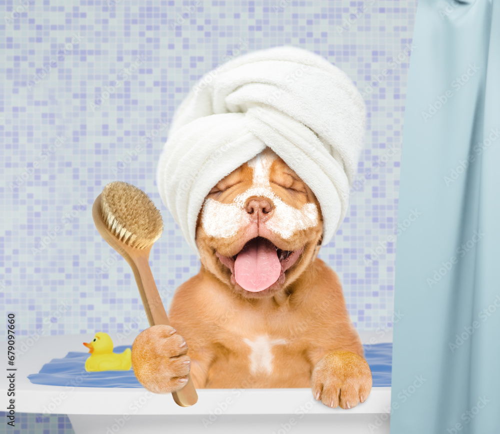 Happy Mastiff puppy with towel on it head and with cream on it face takes the bath and holds shower brush