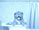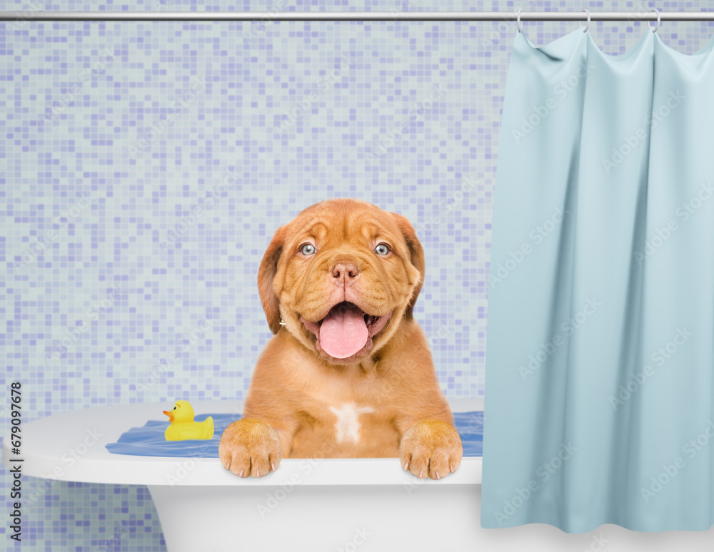 Happy Mastiff puppy takes the bath at bathroom at home