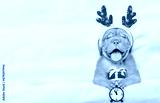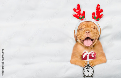 Happy Mastiff puppy dressed like santa claus reindeer Rudolf sleeps under white blanket at home holds gift box and alarm clock. Top down view. Empty space for text