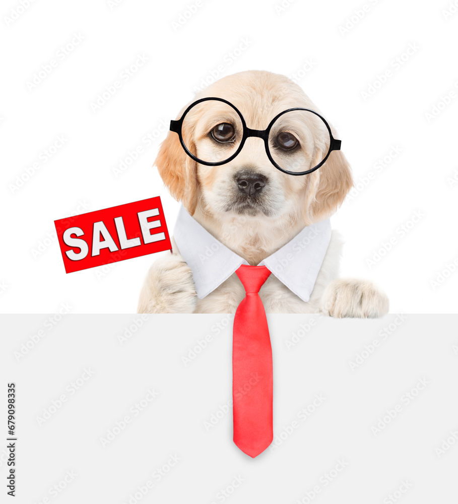 Smart Golden retriver puppy wearing necktie and eyeglasses shows signboard with labeled "sale" above empty white banner. isolated on white background