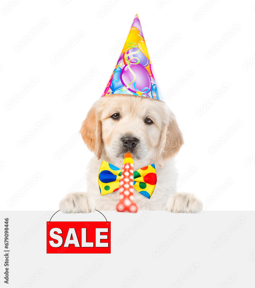 Golden retriever puppy wearing party cap looks above empty white banner blows in party horn and shows signboard with labeled "sale"