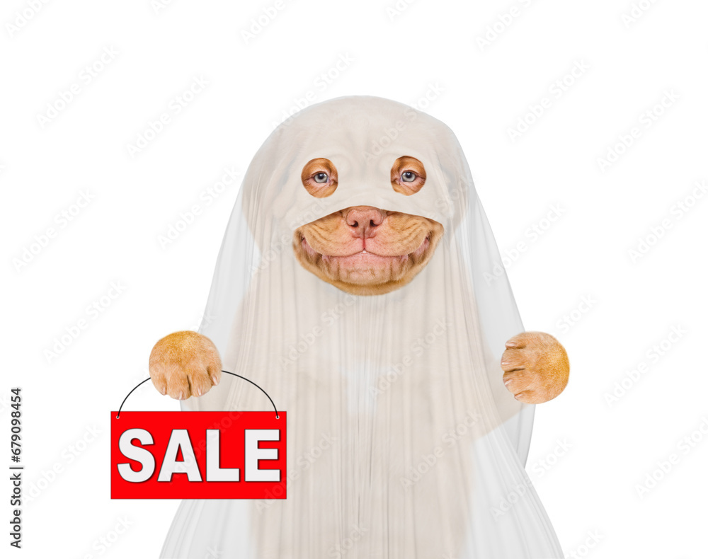 Smiling Mastiff puppy dog celebrating halloween in ghost costume shows signboard with labeled "sale". Isolated on white background