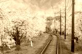 Kyoto, Japan - March 31 2023: Keifuku Tram is operated by Keifuku Electric Railroad. It consists of two tram lines and it's one of the best cherry blossom spots in the west of Kyoto city