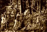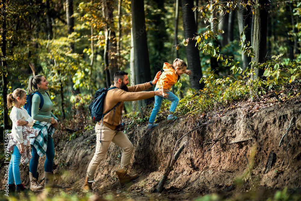 Smiling family of four enjoying hiking in trough forest.