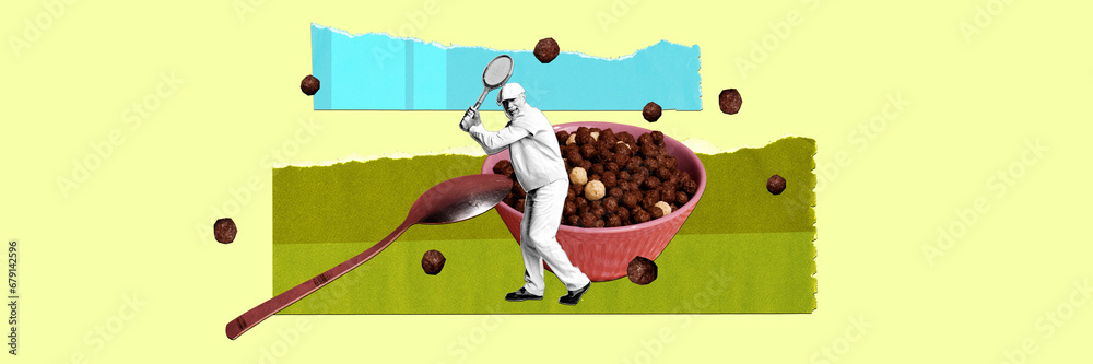 Senior man paying tennis over plate with chocolate cereal against colorful background. Contemporary art collage. Concept of food, creativity, imagination, surrealism, pop art style