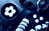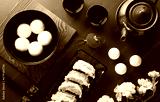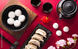 Tang Yuan(sweet dumplings balls), a traditional cuisine for Mid-autumn, Dongzhi (winter solstice ) and Chinese new year with plum flower and tea on red background.