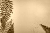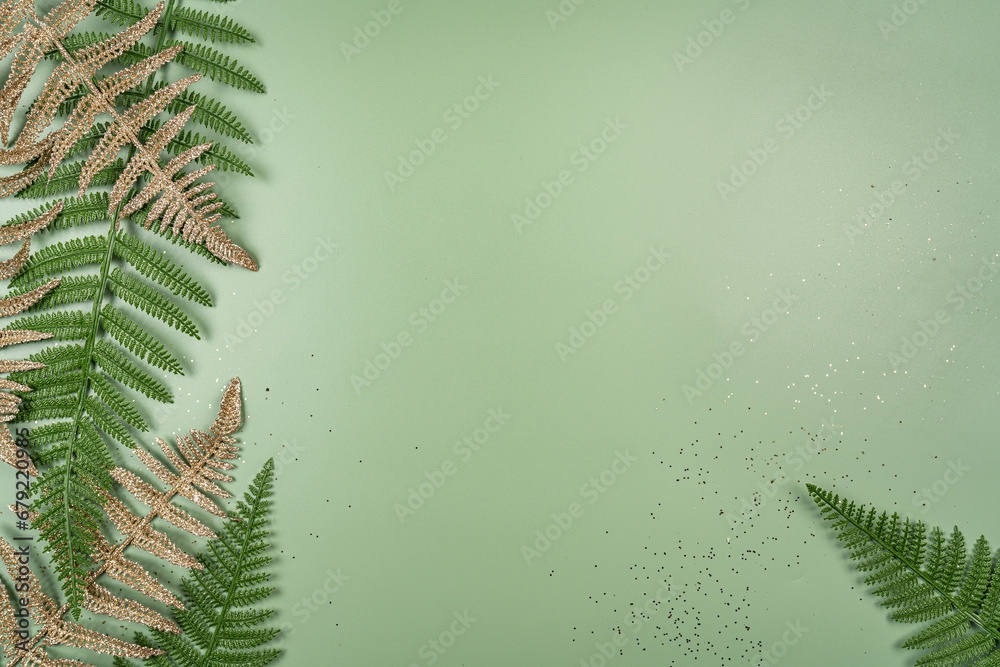 Tropical summer background with green and golden fern leaves set in the frame around blank space for a text, flat lay, top view