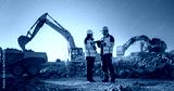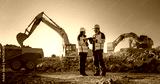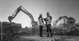 Hispanic Female Inspector Talking to Caucasian Male Land Development Manager With Tablet On Construction Site Of Real Estate Project. Excavators Preparing For Laying Foundation. Hot Sunny Day