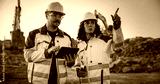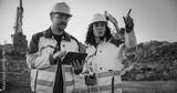 Caucasian Male Civil Engineer Talking To Hispanic Female Inspector And Using Tablet Computer On Construction Site of New Building. Real Estate Developers Discussing Business, Excavators Working.