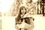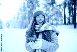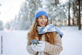 A young woman in a snowy park with a phone in her hands communicates via video and takes a selfie. Beautiful female tourist with phone having fun outdoors. Travel concept.