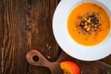 Autumn pumpkin soup on rustic wooden background, healthy vegan dinner