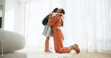 Woman, daughter and hug for love, school and backpack for education, ready and goodbye at home. Mother, girl and child development or smile, happy and greeting or care, embrace and support for class