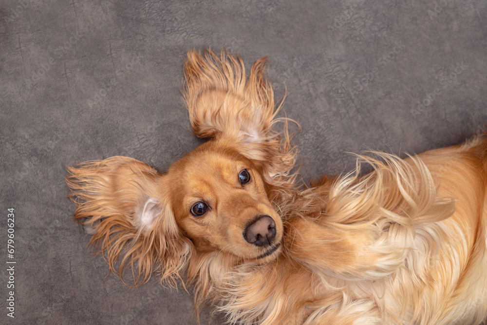 Cute playful doggy or pet Cocker Spaniel puppy dog on bed. Funny moments of a dog