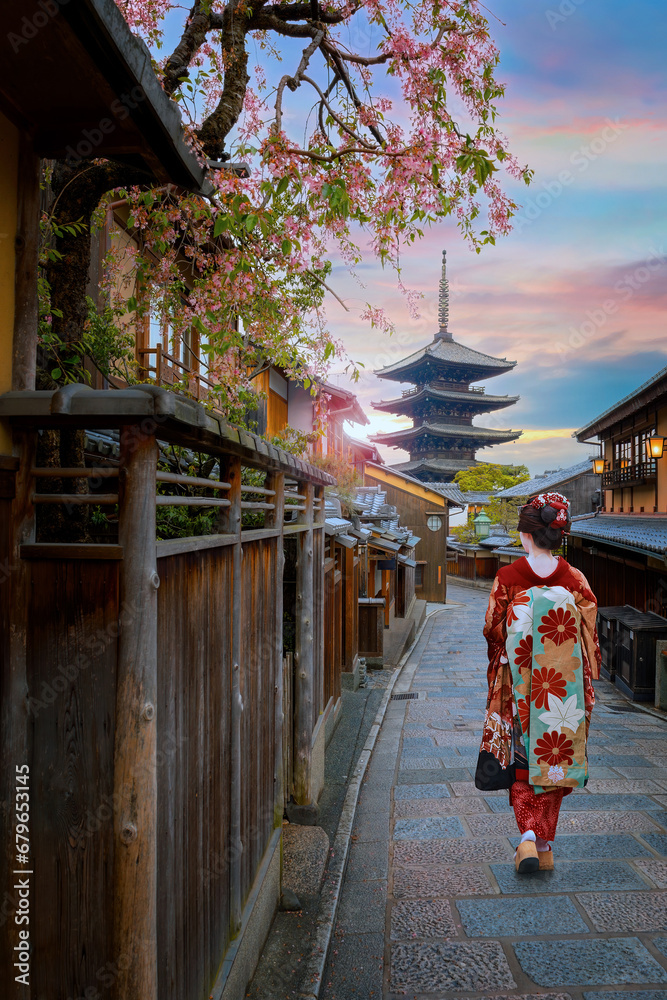 Young Japanese woman in traditional Kimono dress with Yasaka Pagoda at Hokanji temple in Kyoto, Japan during full bloom cherry blossom in spring
