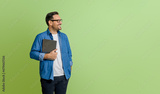 Thoughtful happy young businessman with hand in pocket holding digital tablet on green background