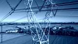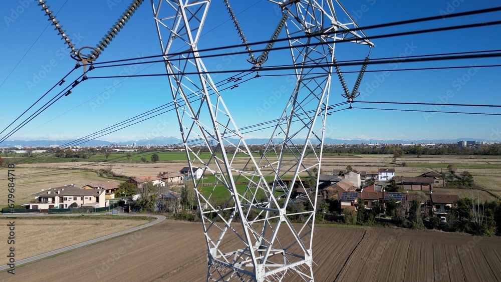 High voltage pylon for the transport of electricity and houses with solar panels close to Milan in Lombardy Italy Europe - green revolution, Save the planet and climate change - increase energy cost