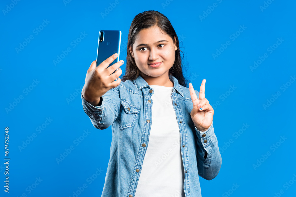 Young Asian women showing v-sign pose while taking selfie on cell phone