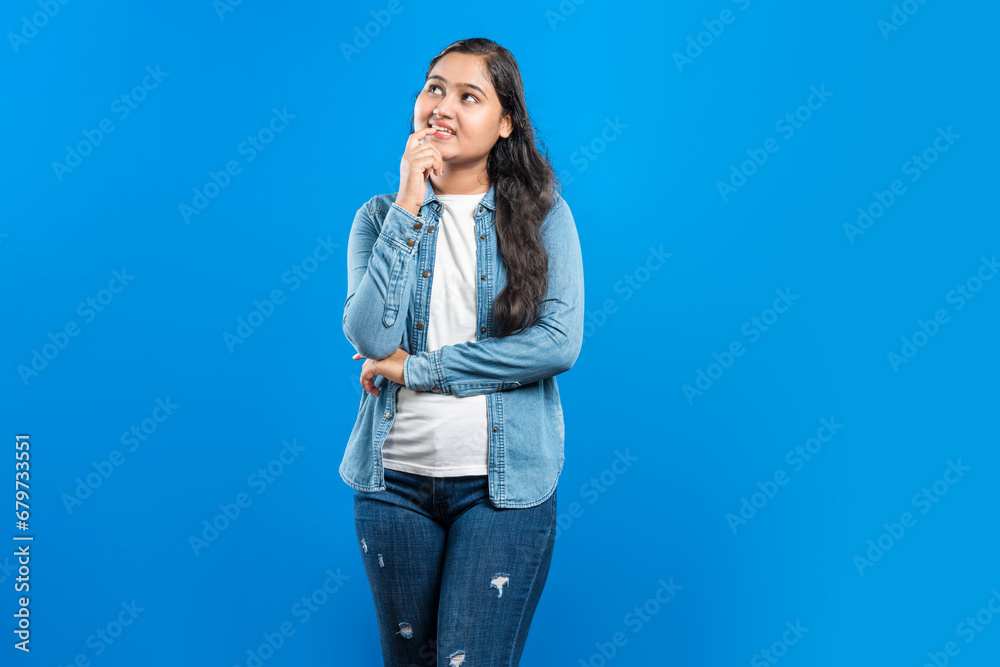 Portrait of an attractive lovely Indian girl thinking over blue background