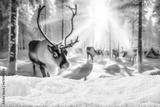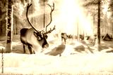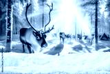 Winter backgoround of snow and empty place for your decoration. Blurred landscape of forest and reindeers. Chrismtas magic time. Mountains and trees. Cold december day. Mockup background and frost.