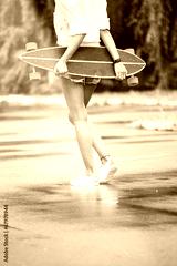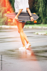 Fashion lifestyle, beautiful young woman with longboard. Lightle